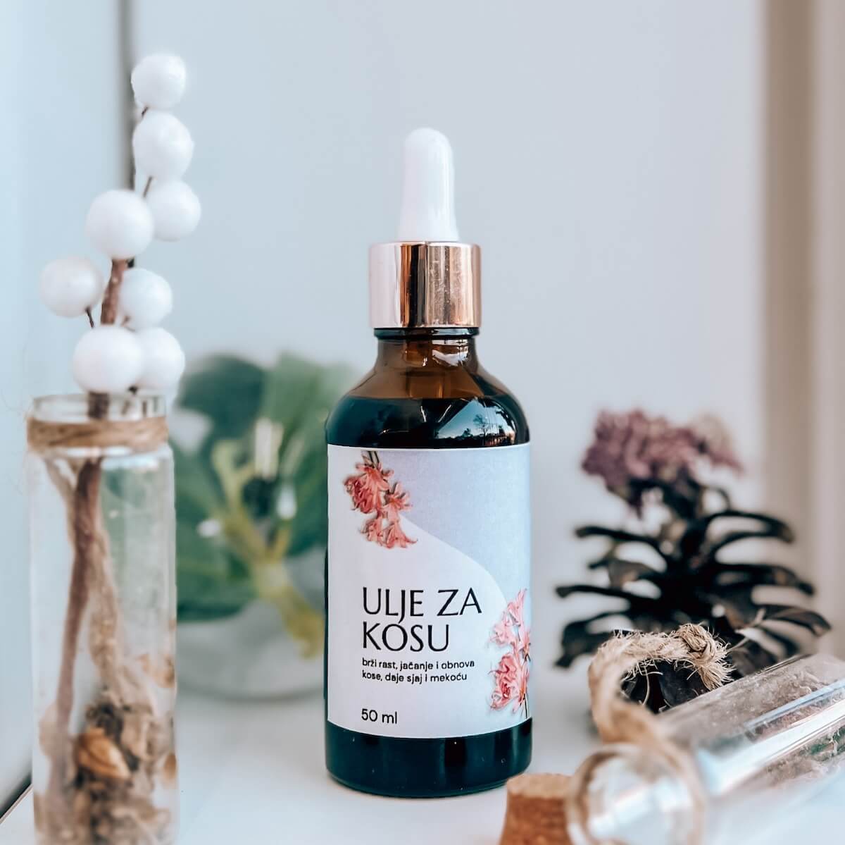 Ulje za kosu je potpuno prirodan, ručno rađen biljni proizvod na bazi 100% hladno ceđenih ulja i etarskih ulja. Kombinacija ulja je osmišljena tako da sprečava gubitak kose i pomaže brži rast kose, jača koren kose i obnavlja oštećenu kosu, hidrira i čuva kosu od gubitka vlažnosti a nakon upotrebe kosa je mekana i sjajna.
